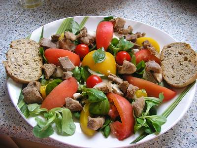 je n'ai pas éssaye de faire la salade, j'ai remplacer par du thon car j'étais au bureau et hier pas envie de cuisiner plus.mais vos commentaires me donnent envie de la faire |