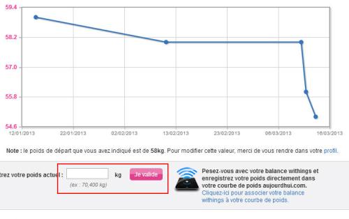Désolé, mais je suis un peu confus : Parle-t-on de courbe de poids ou de courbe de pas ? Si c'est bien de courbe de poids, j'ai joint une image explicative : Il faut écrire votre poids dans la petite fenêtre que j'ai encadrée de rouge :) Si c'est la courbe de pas, possédez vous un podomètre Aujourdhui.com (FitBug, FitBit, etc) ? Si ce n'est pas le cas, vous ne pourrez pas rentrer manuellement votre nombre de pas. Néanmoins, vous pouvez le faire sur la courbe de pas Aujourdhui.com disponible ici : http://www.aujourdhui.com/courbe-de-pas/manuelle/ J'espère avoir répondu à vos questions, je reste à votre disposition en cas de nouvelle interrogation :) Je vous souhaite une magnifique journée ! |