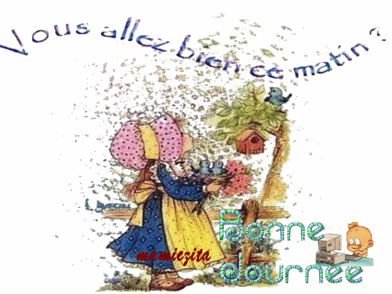 BONJOUR LES FILLES..... DANIELLE ET AUDIROUGE ....vous etes des matinales..... comment vas-tu ce matin audirouge.....bien j'espére... CATOUILLE fais attention sur ton scoot.....comment va ton genou , il doit être un peu raide ce matin.... KARINOU , toujours au lit avec le p'tit marcou..... CHOUPETTE , tu vas aller acheter tes plantations aujourd'hui..... NICKY , ne me dis pas que tu es encore dans la bouffe..... IRENE , vient nous faire un p'tit coucou... NAD la polonaise te dit bonjour..... voilà j'ai fais le tour...si j'en ai oublié une qu'elle se manifeste..... bisous à vous toutes.... |